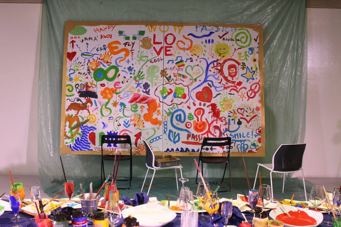 "Trust" took place during the event "Thinking Hub 2015" held by Fastweb. The artist set up a dinner table replacing food and cutlery with paint and brushes. He invited the participants to give their contribution to a collective work of art, adding his mark to the final painting.
